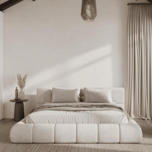 The Off White Upholstered Platform Bed offers a clean, modern aesthetic with soft off-white fabric upholstery and a sturdy wooden platform base. Designed for comfort and style, it features a low-profile frame and a plush headboard, making it the perfect centerpiece for a contemporary bedroom.
