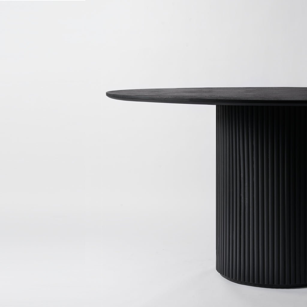 A bold and stylish solid wood dining table with a sleek black finish, perfect for making a modern statement in your dining area.