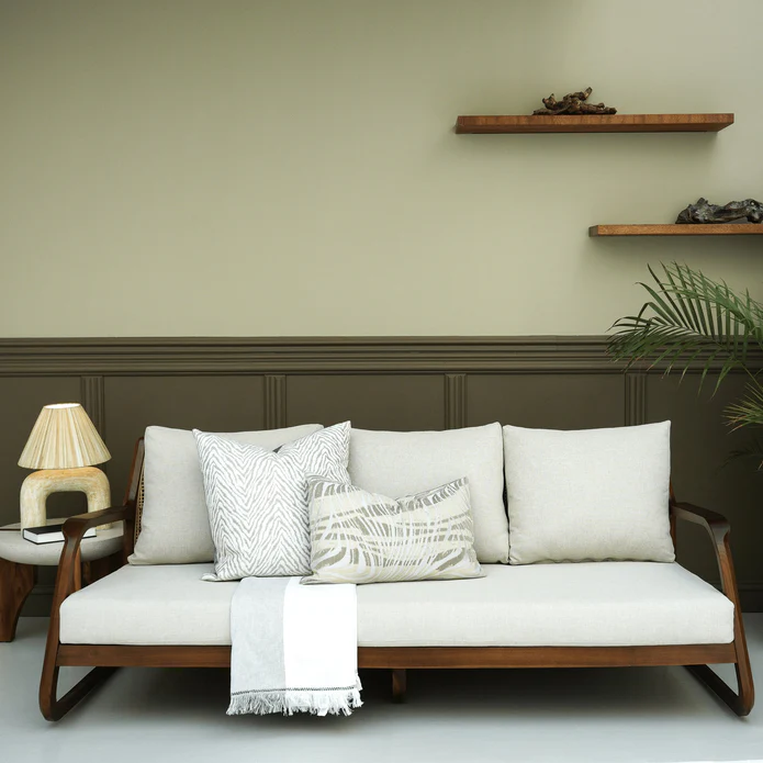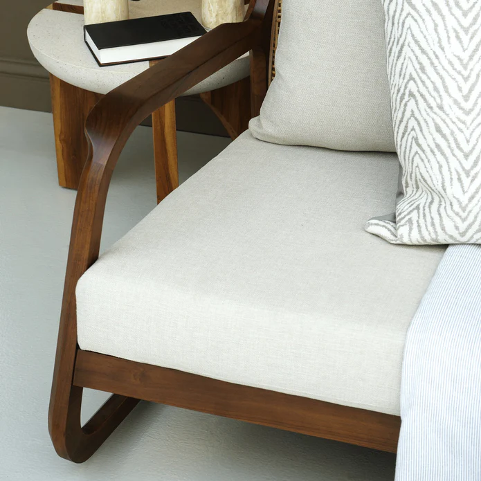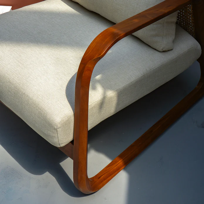 The Teak Frame Armchair features a solid teak wood frame known for its strength and rich grain. Combining durability with elegant craftsmanship, this armchair offers comfortable seating with a timeless design, perfect for living rooms, lounges, or patios.