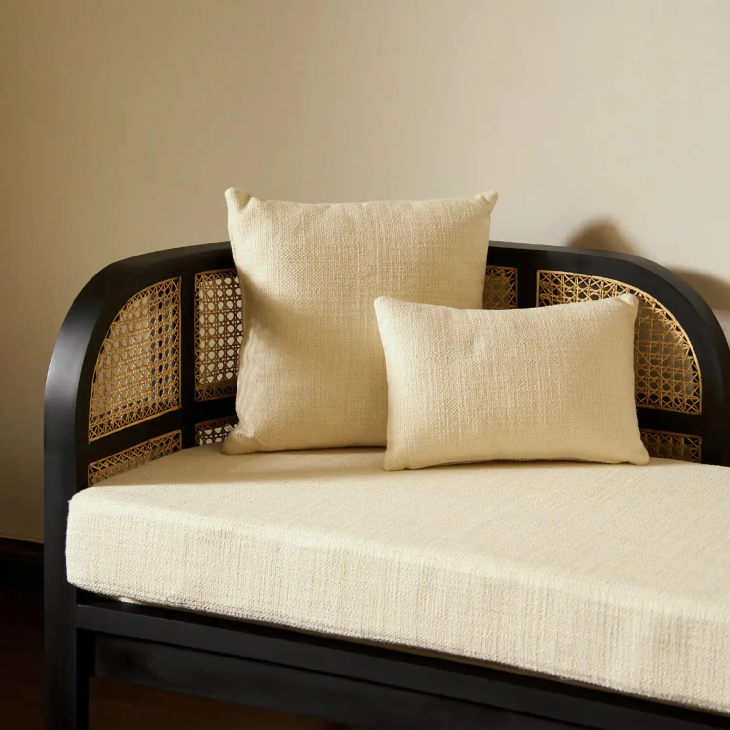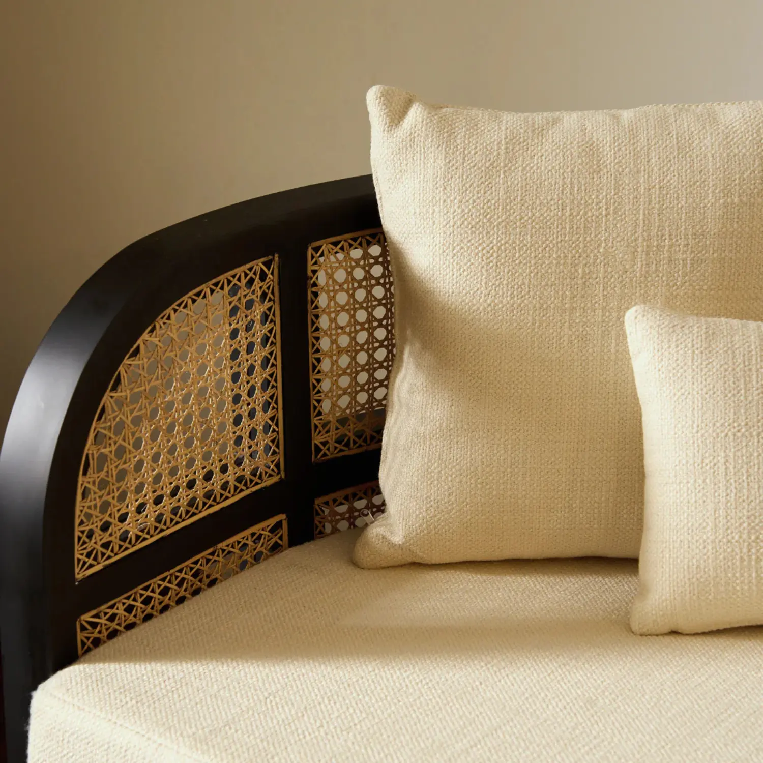 A beautifully crafted sofa featuring a natural cane-woven frame and plush cushions for comfortable seating. Its airy design and organic texture bring a relaxed, timeless charm to any living space.