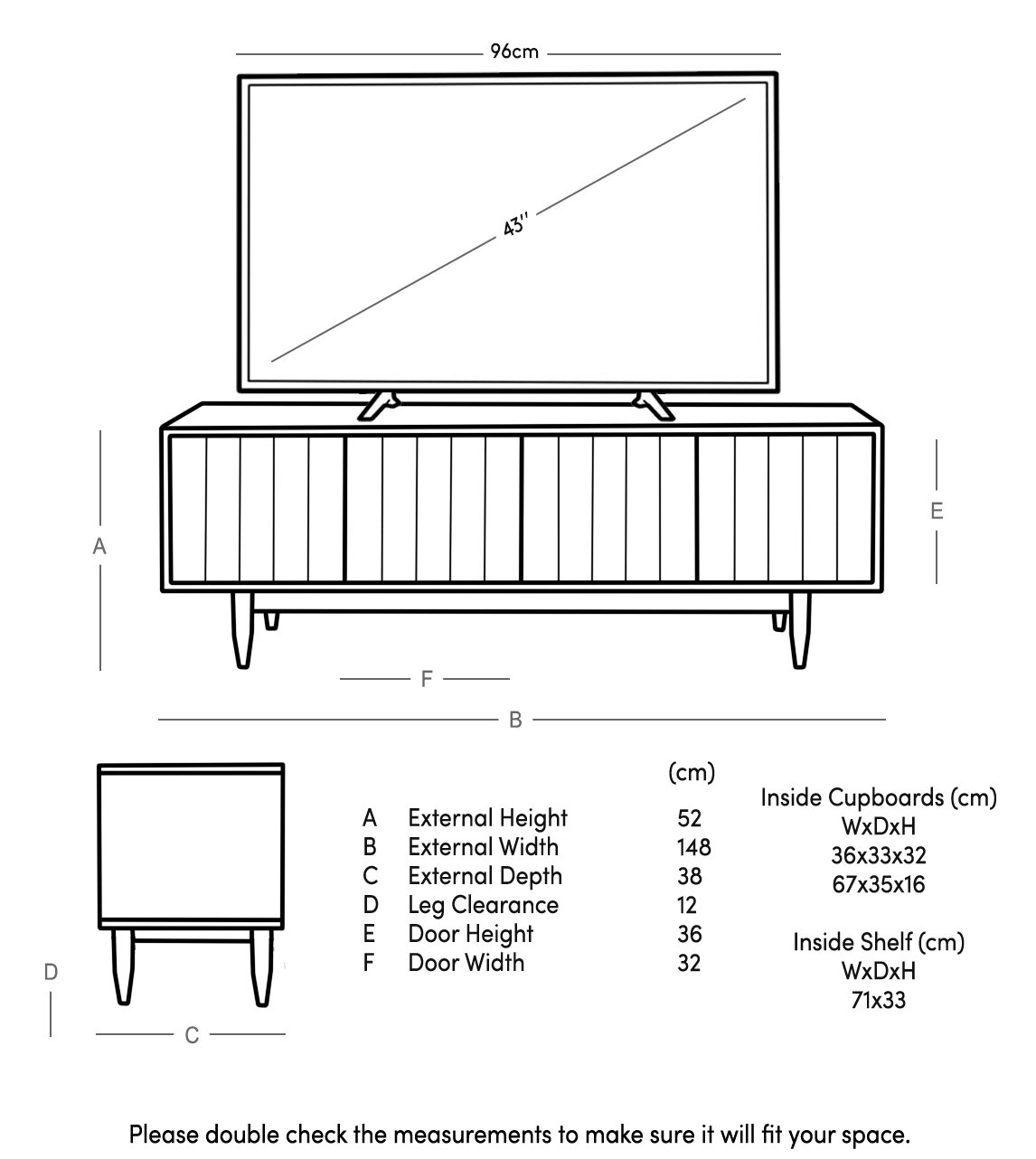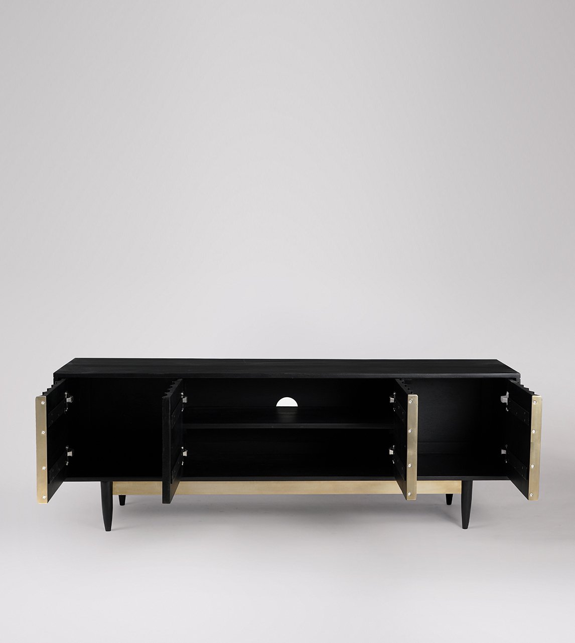 The Foxe TV Stand is a sleek and functional media unit made from solid wood. Featuring a spacious surface and practical storage, it combines durability with a modern aesthetic to complement any living room.