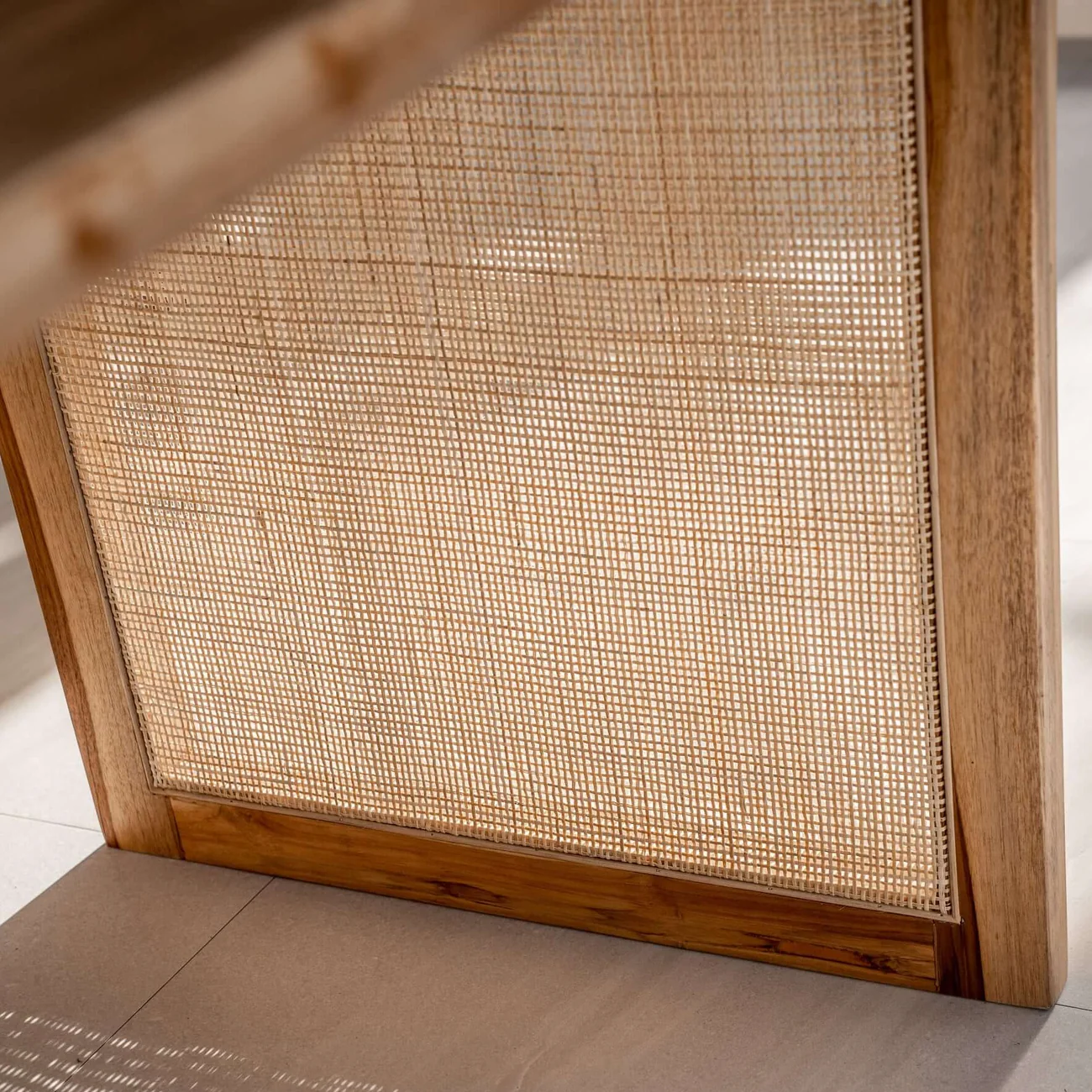- Material: Natural wood and textured rattan