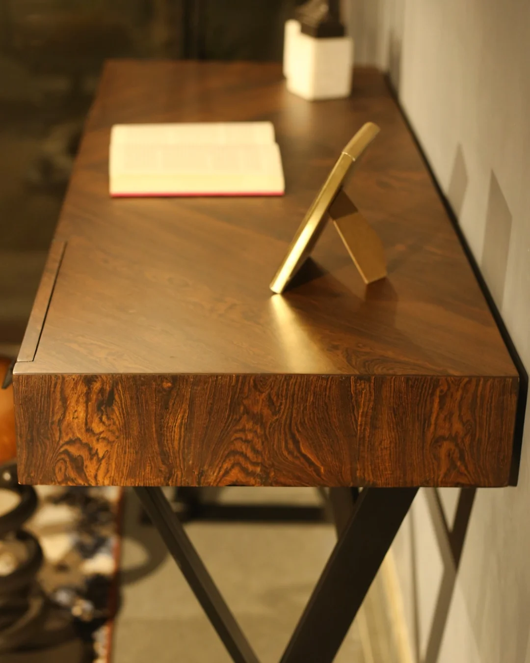 A sleek fusion of solid wood and sturdy metal legs, this writing desk offers an industrial charm with lasting durability. Perfect for modern workspaces and creative corners.