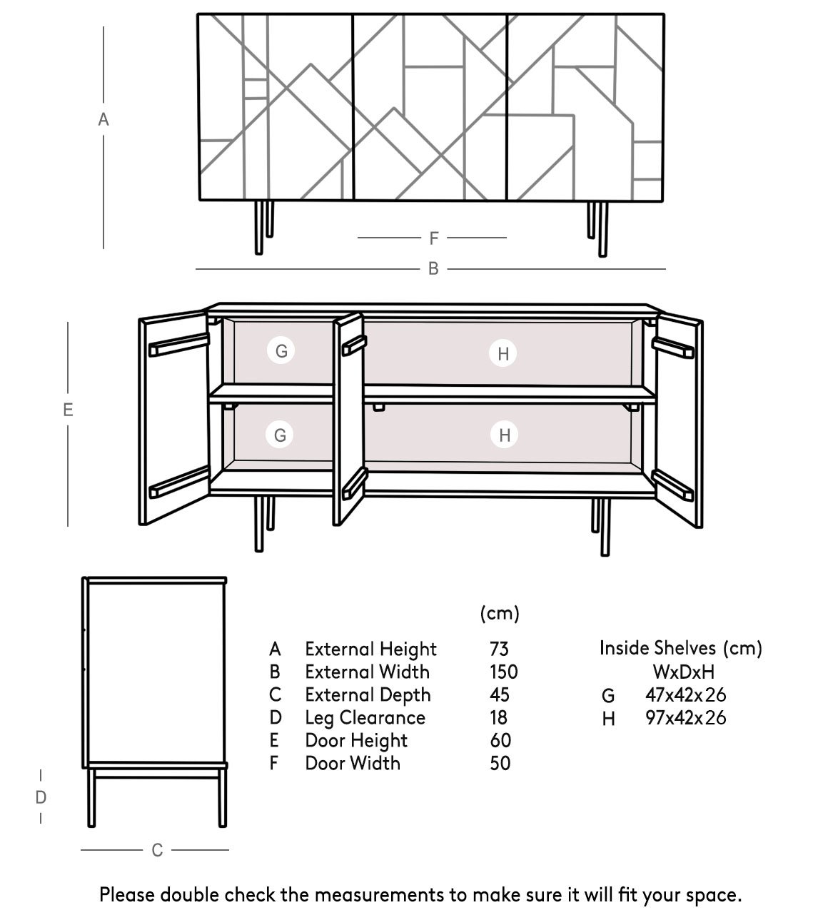 Dimensions: 45 cm (L) x 150 cm (W) x 57 cm (H)