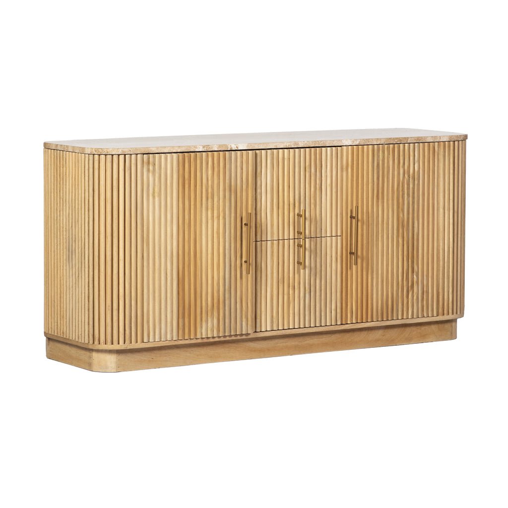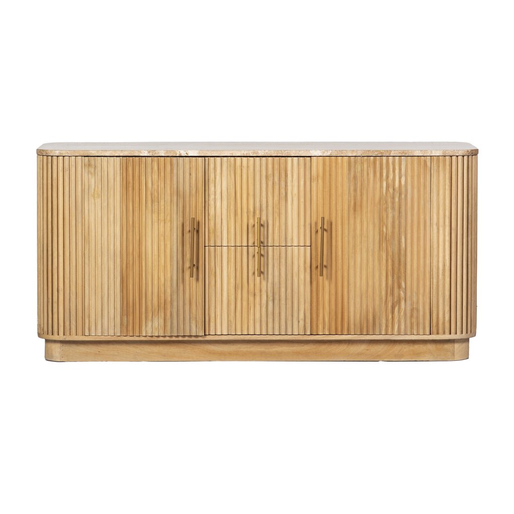 A sophisticated buffet featuring a solid wood base with a polished marble top, blending durability with timeless elegance. Ideal for stylish storage and serving in dining or living areas.