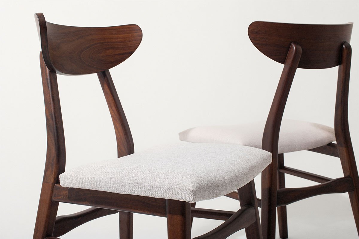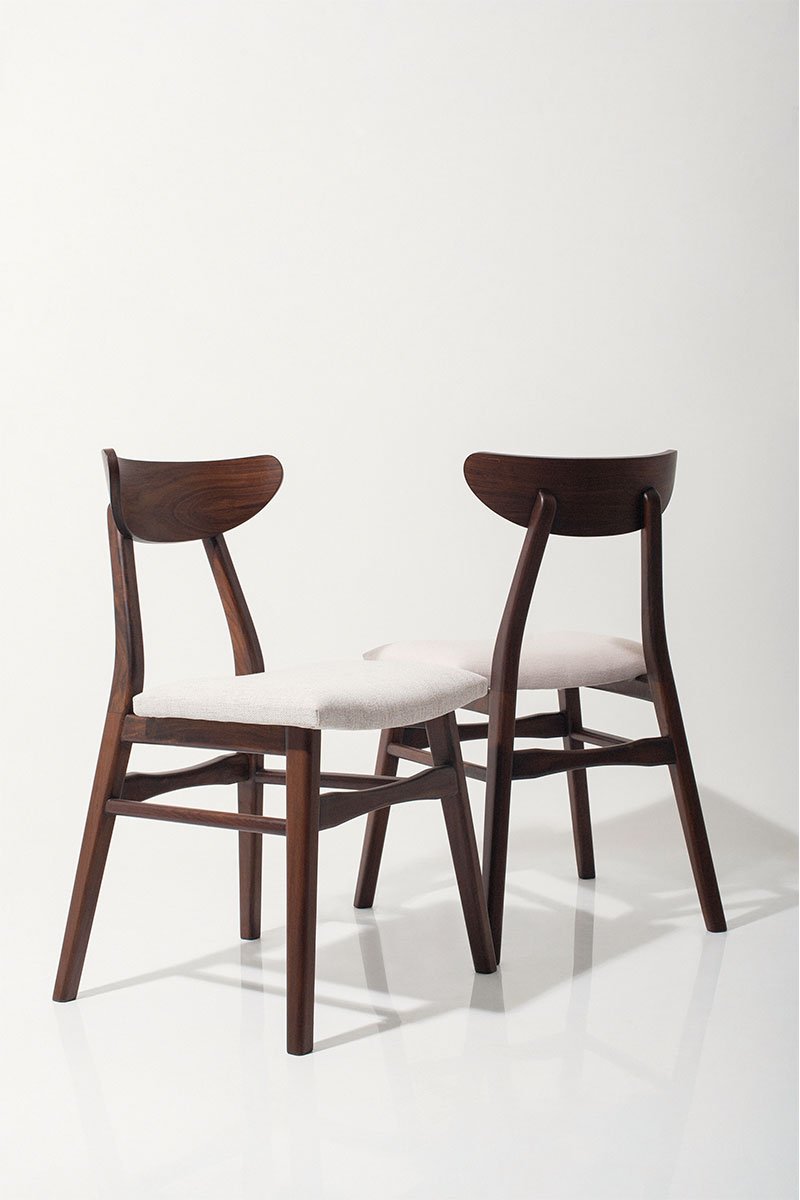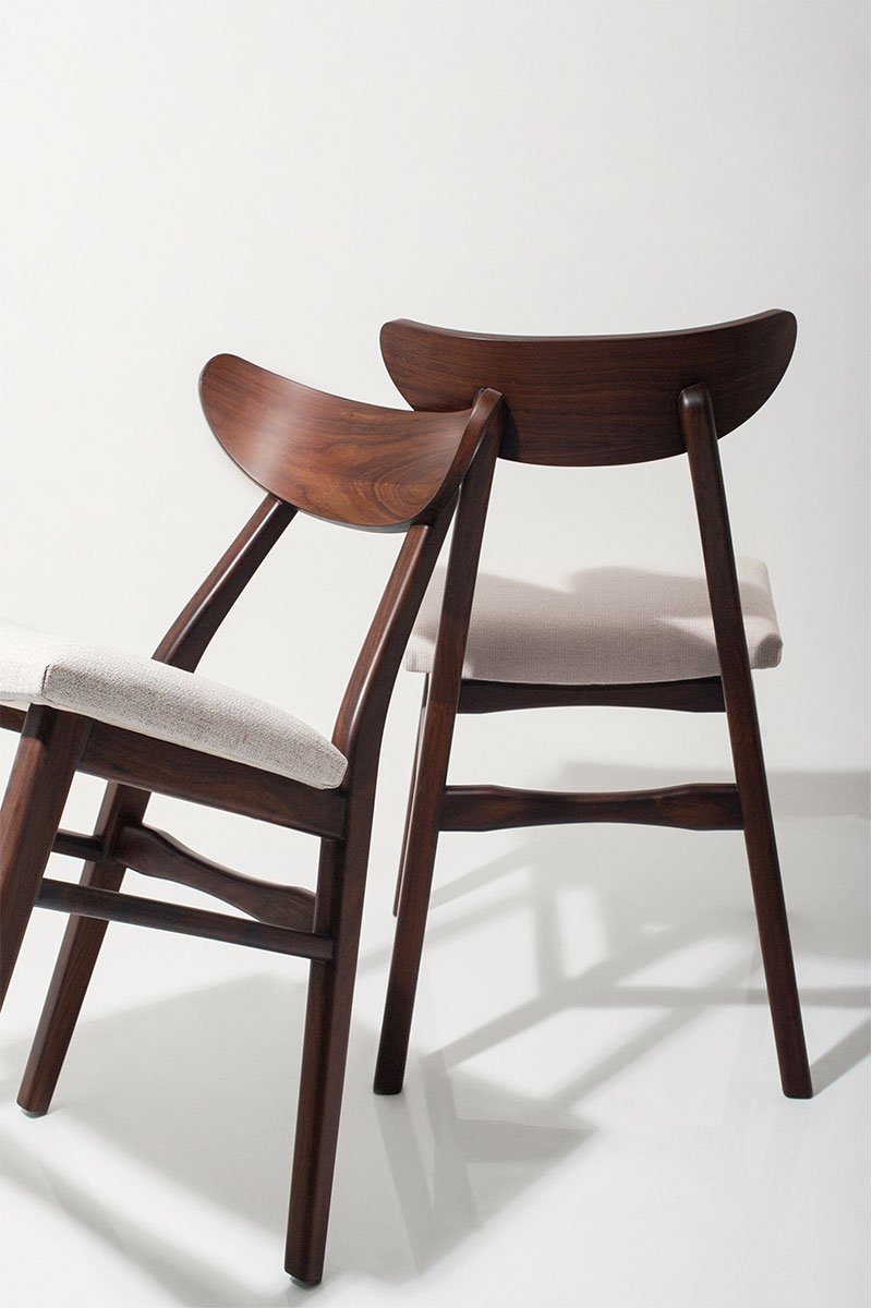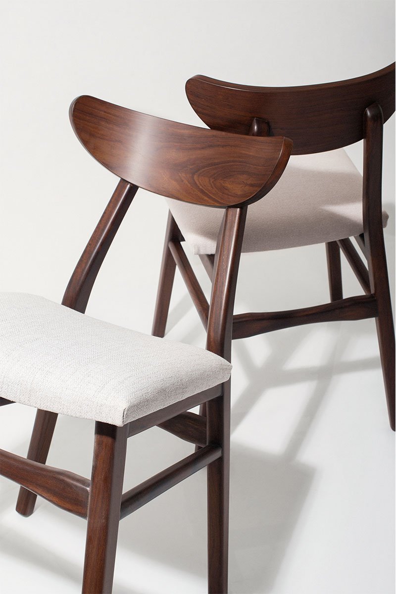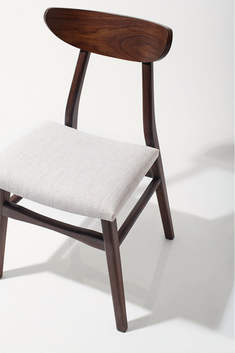 A sleek mid-century modern dining chair made from solid walnut wood, featuring clean lines and a comfortable fabric-upholstered seat. Perfect for adding timeless style and comfort to your dining area.