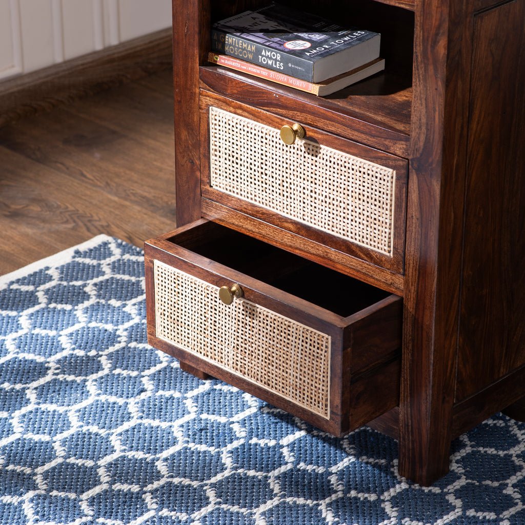 Combining solid wood craftsmanship with natural rattan detailing, this bedside table offers a warm, textured look and practical storage. A perfect blend of rustic charm and functionality.