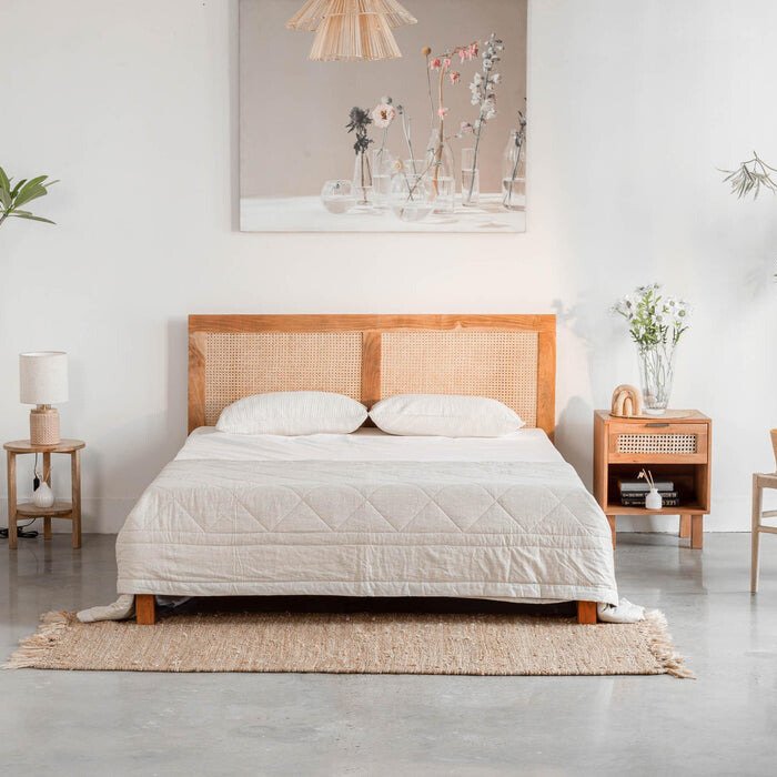 The Niva Platform Bed showcases a minimalist design with a low-profile structure, expertly crafted from solid wood. Its clean lines and sturdy build make it a stylish and durable choice for modern bedrooms.