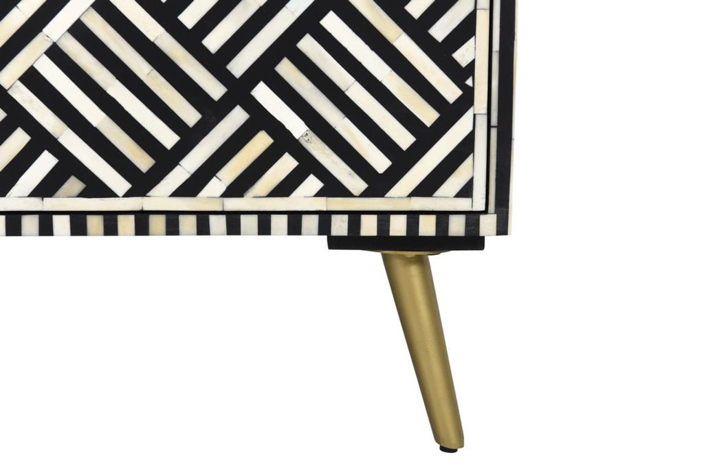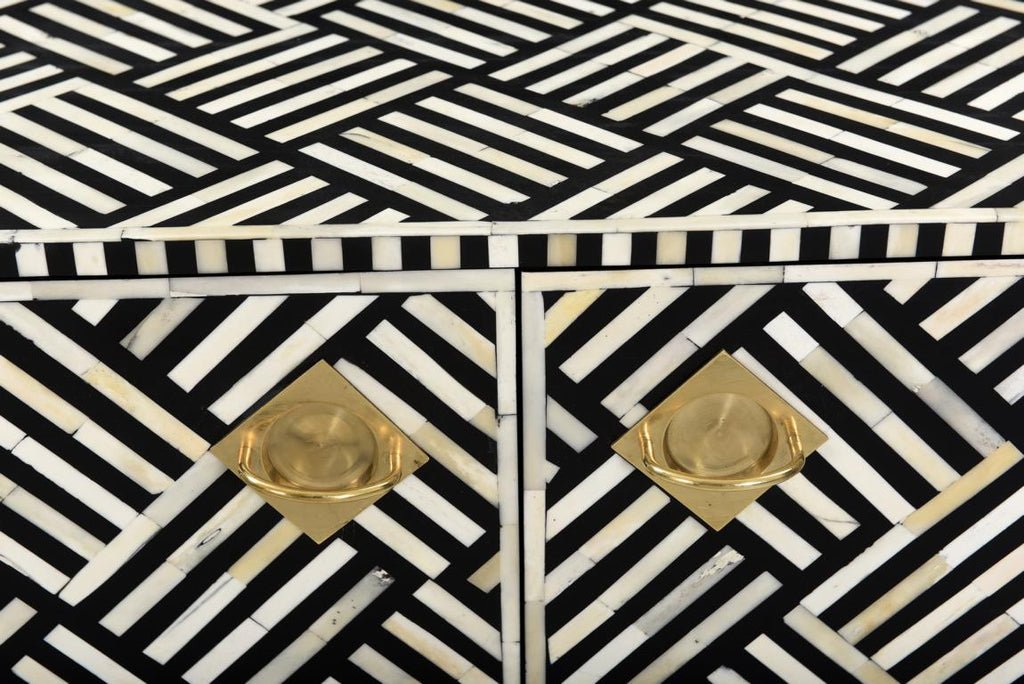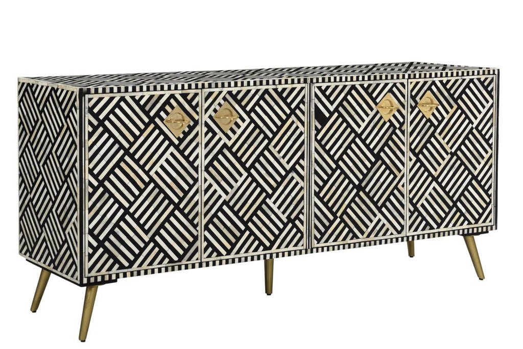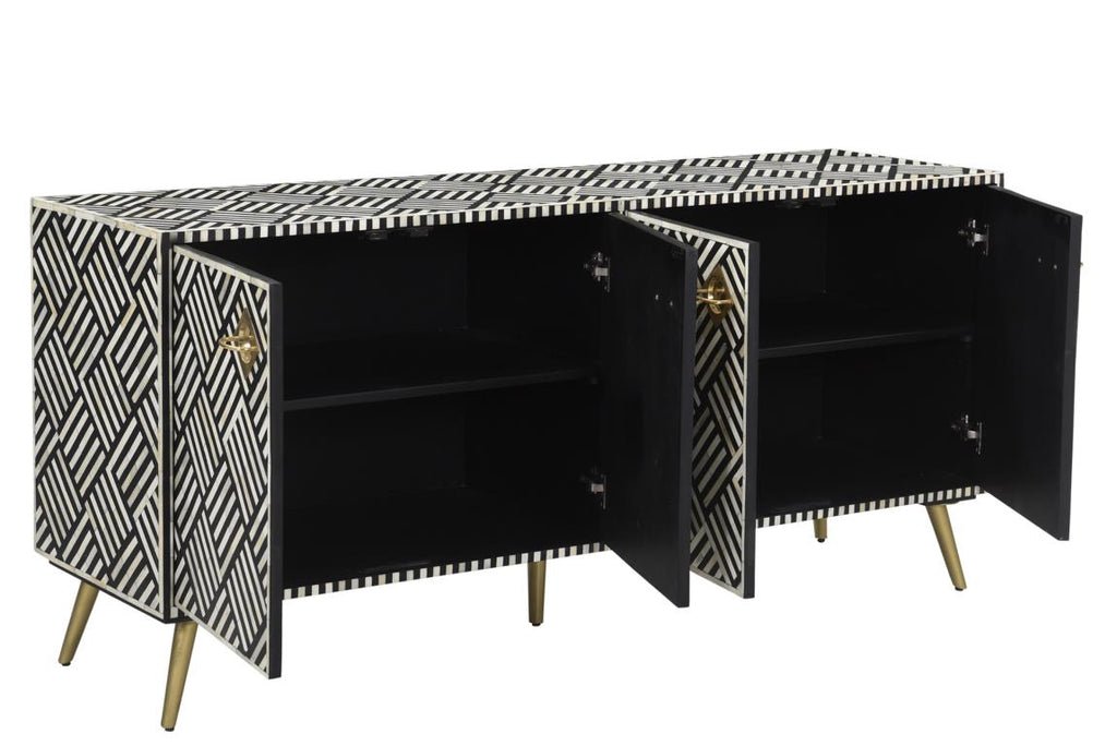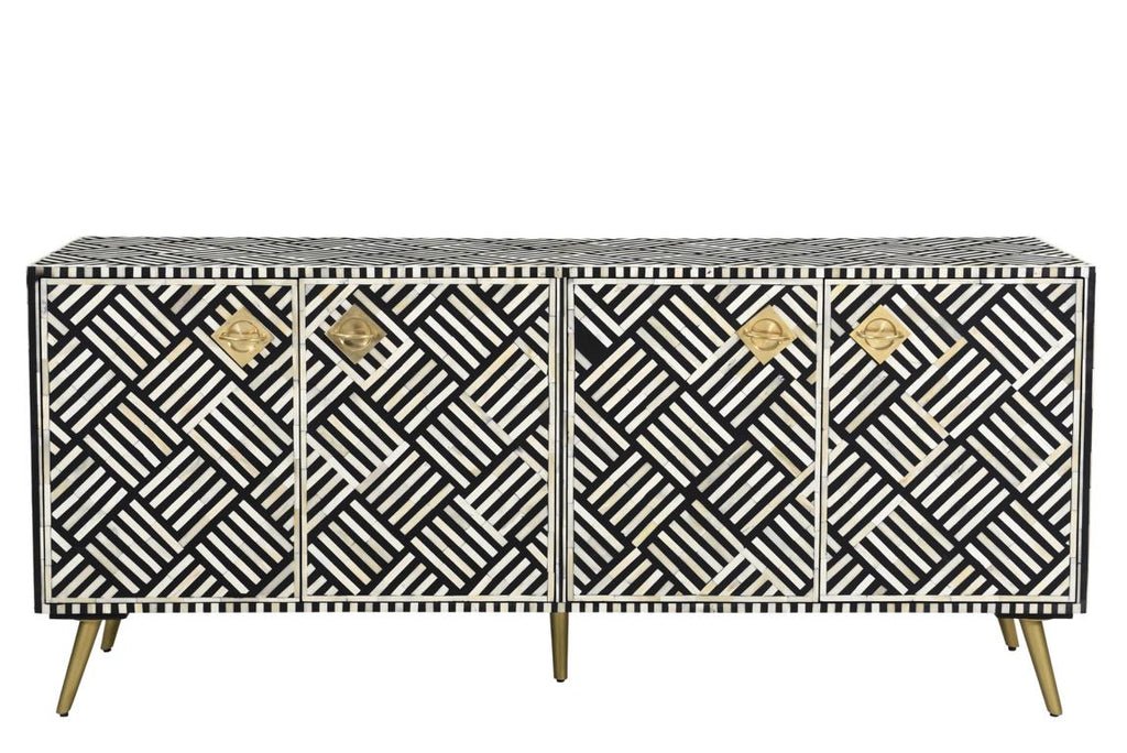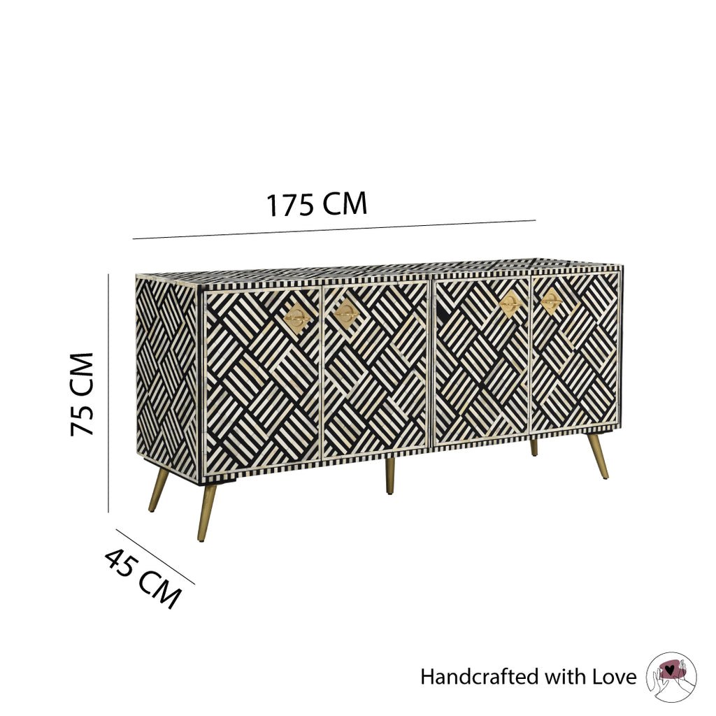 The Optical Bone Inlay Sideboard features striking geometric bone inlay patterns on a solid wood frame. Its sleek, elongated design offers ample storage while adding a modern artistic touch to your space.