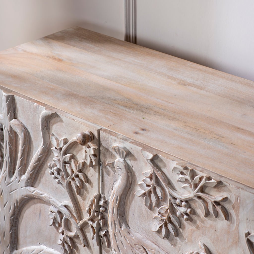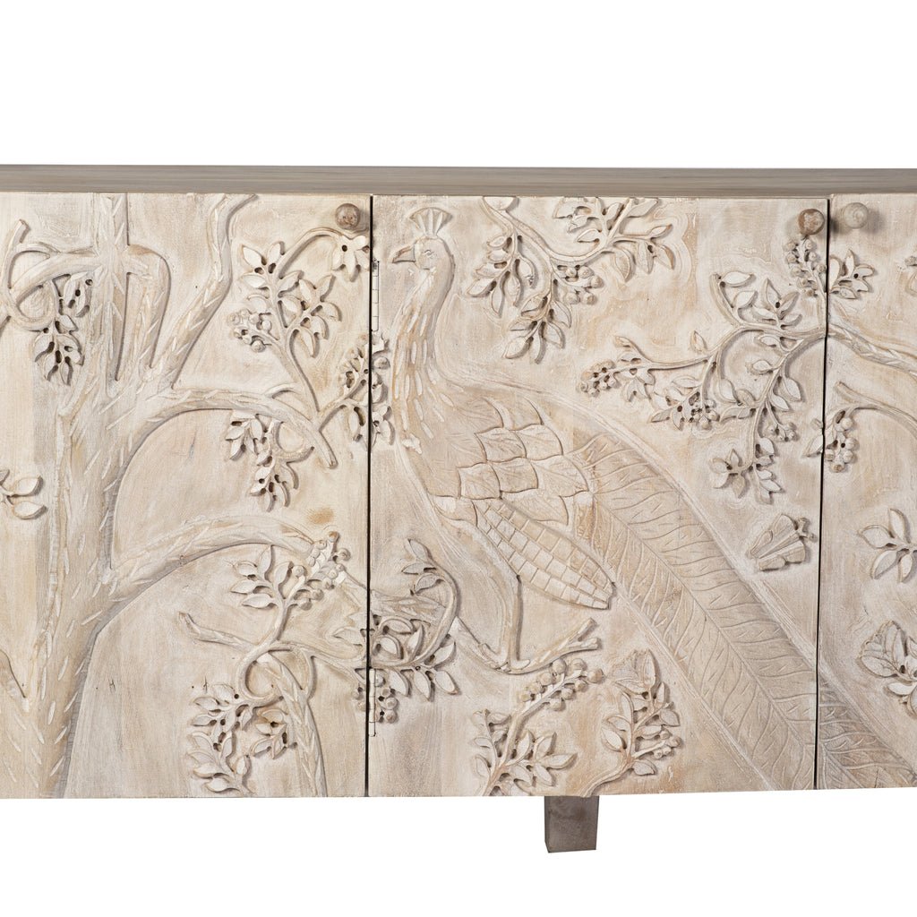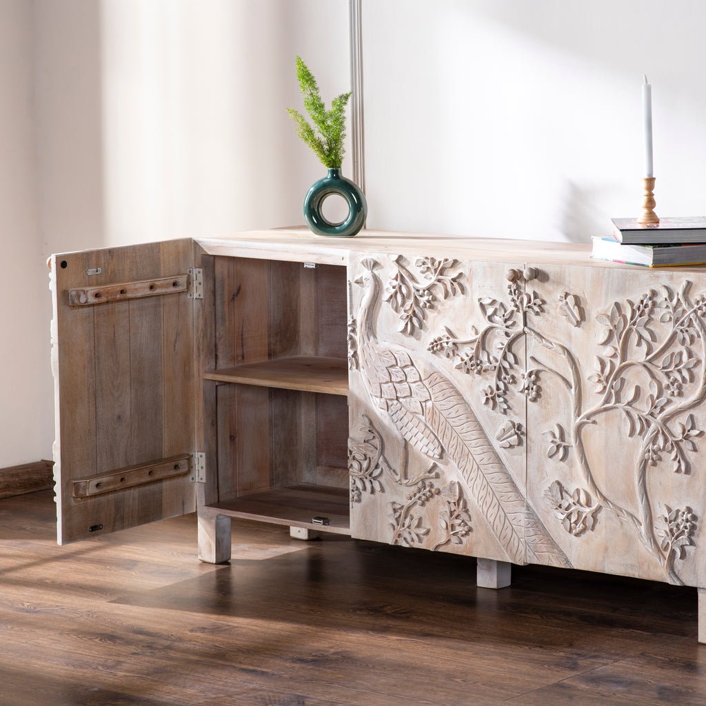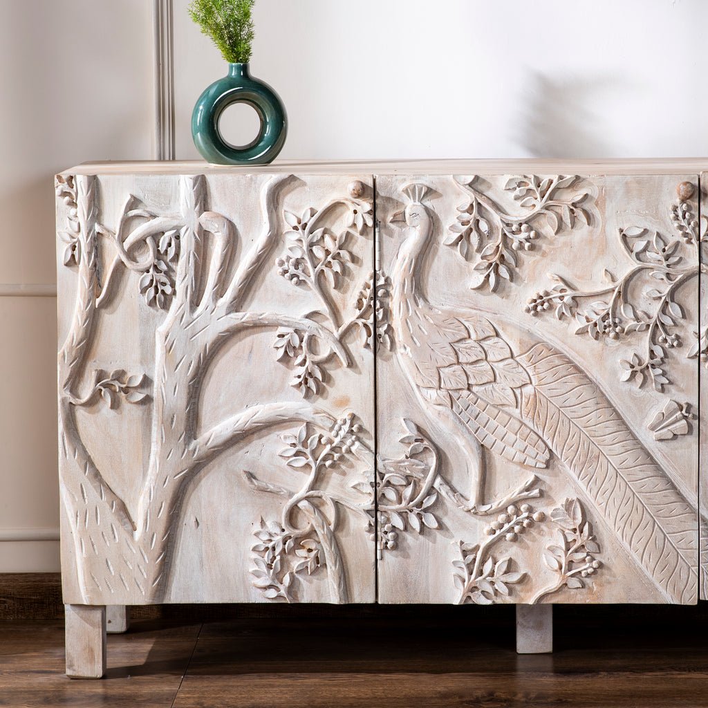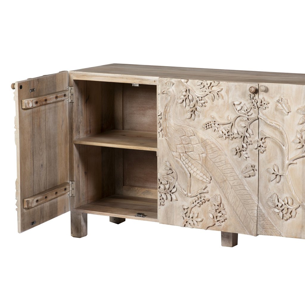 The Peacock Buffet features a solid wood construction with a spacious design, offering ample storage and surface area. Its elegant craftsmanship and sturdy build make it a perfect blend of style and functionality for any dining or living space.