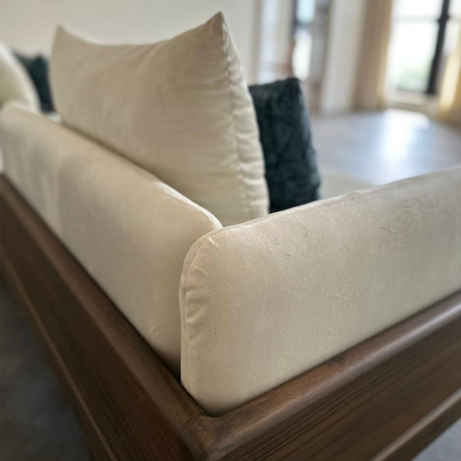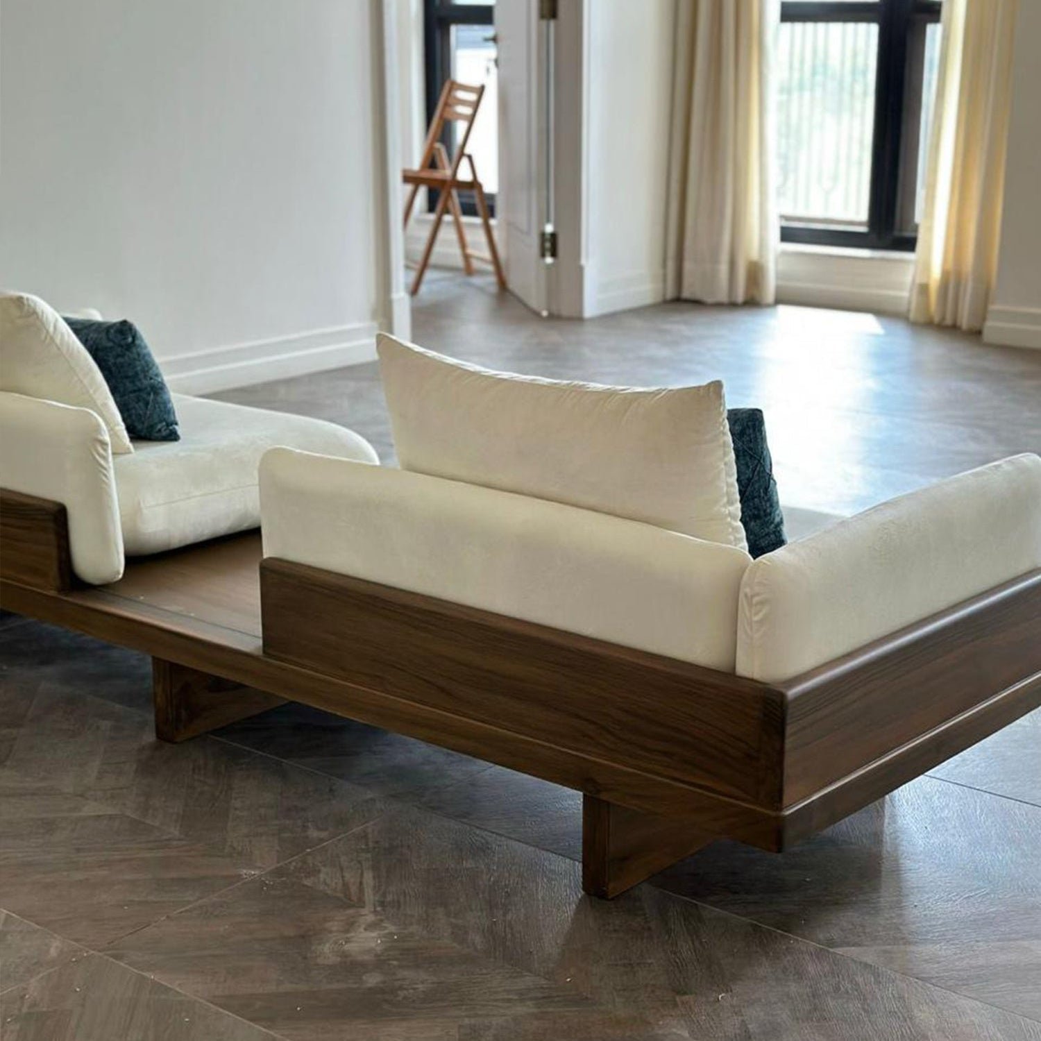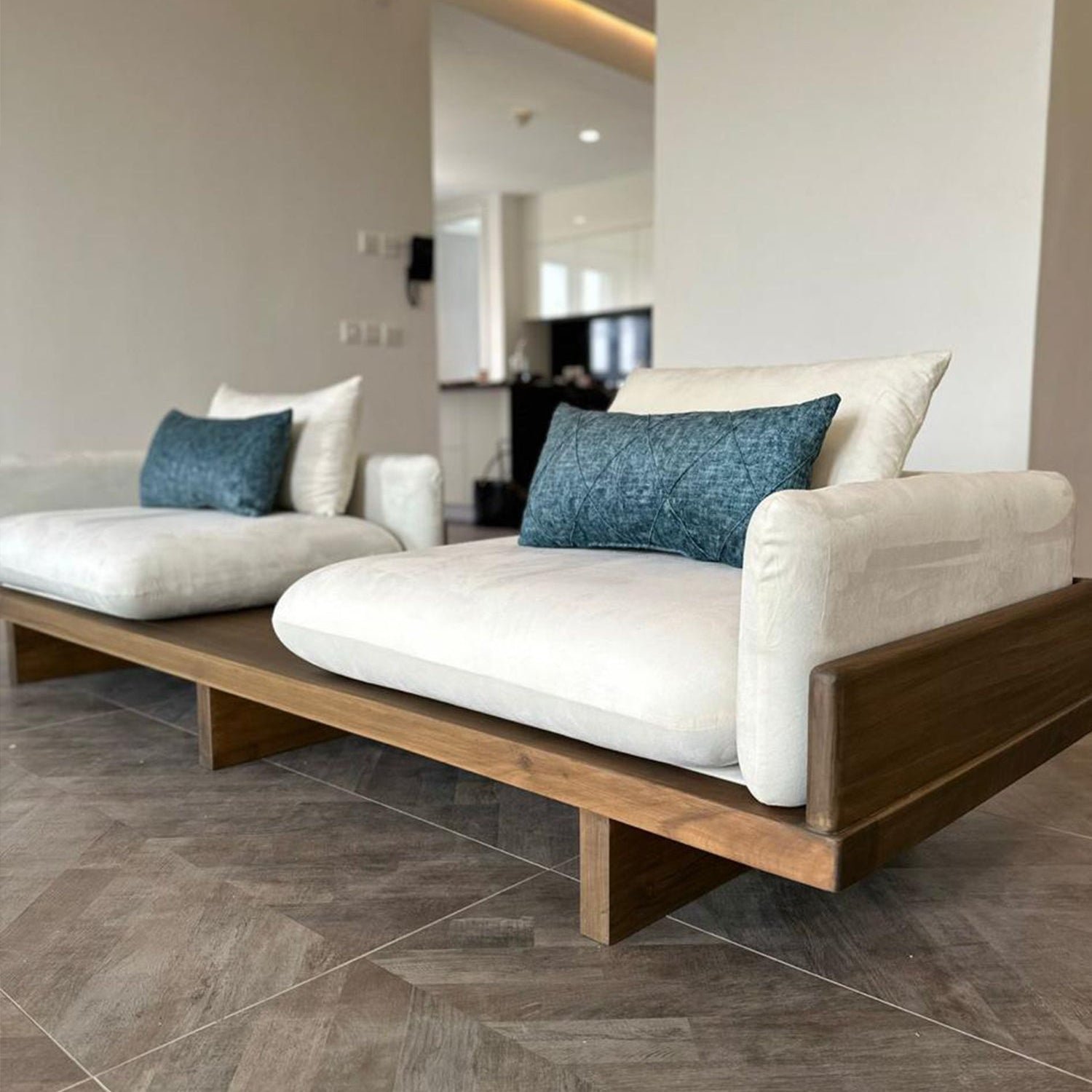 The Platform Sofa features a sleek, low-profile design crafted from solid wood. Its minimalist style and sturdy construction provide both comfort and modern elegance for any living space.