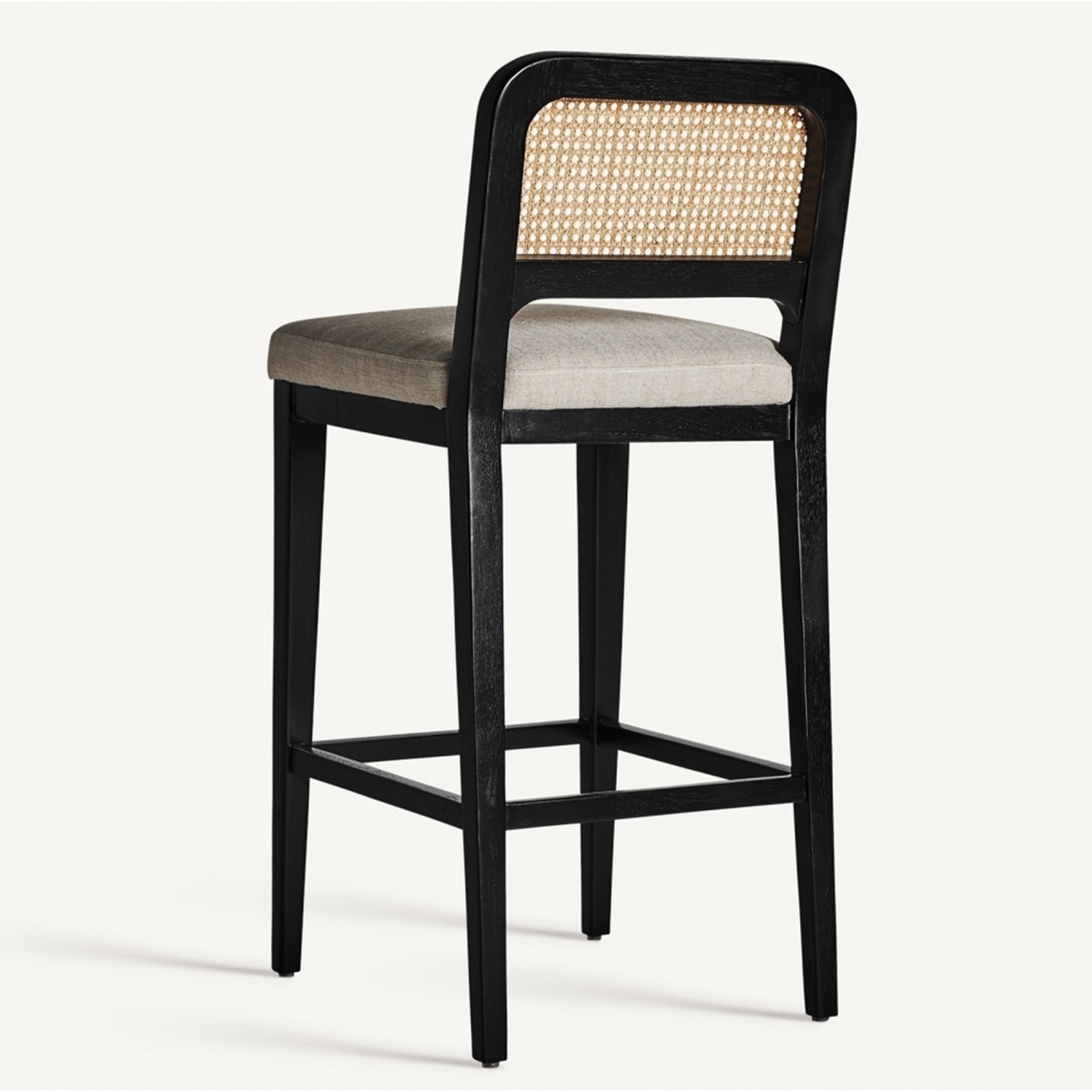 Combining classic charm with contemporary style, the Raffles Bar Stool features a solid wood frame in black finish complemented by a natural cane seat and backrest. Its tall design offers comfort and elegance, perfect for kitchen islands or bars.