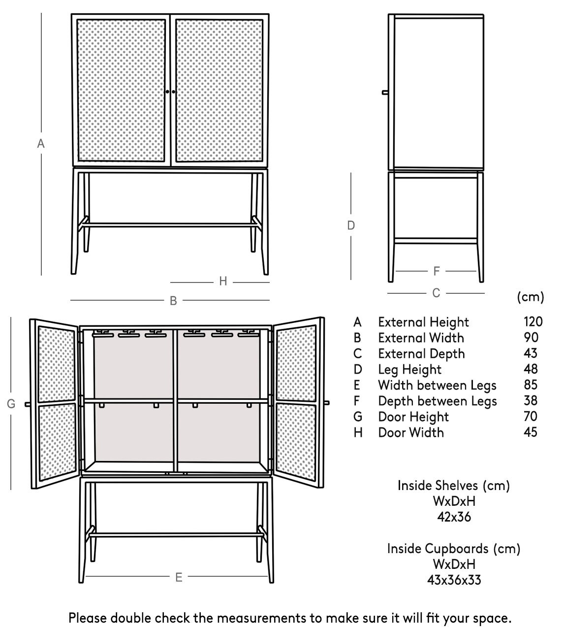 Dimensions: 43 cm (L) x 90 cm (W) x 120 cm (H)