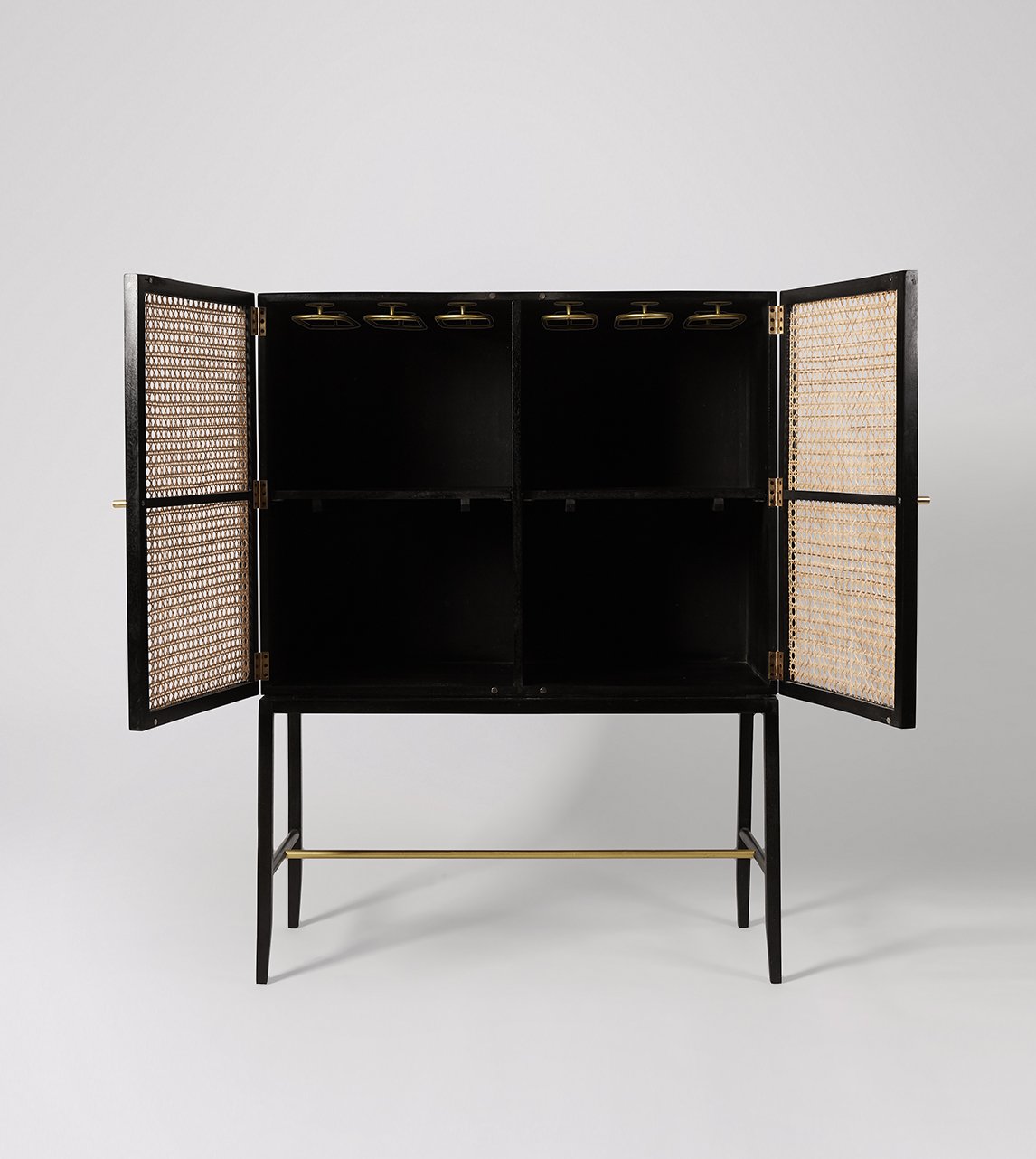 Tags: Bar Storage, Black Mango Wood, Brass Handles, Drinks Cabinet, Mid-Century Modern, Raphia, Rattan