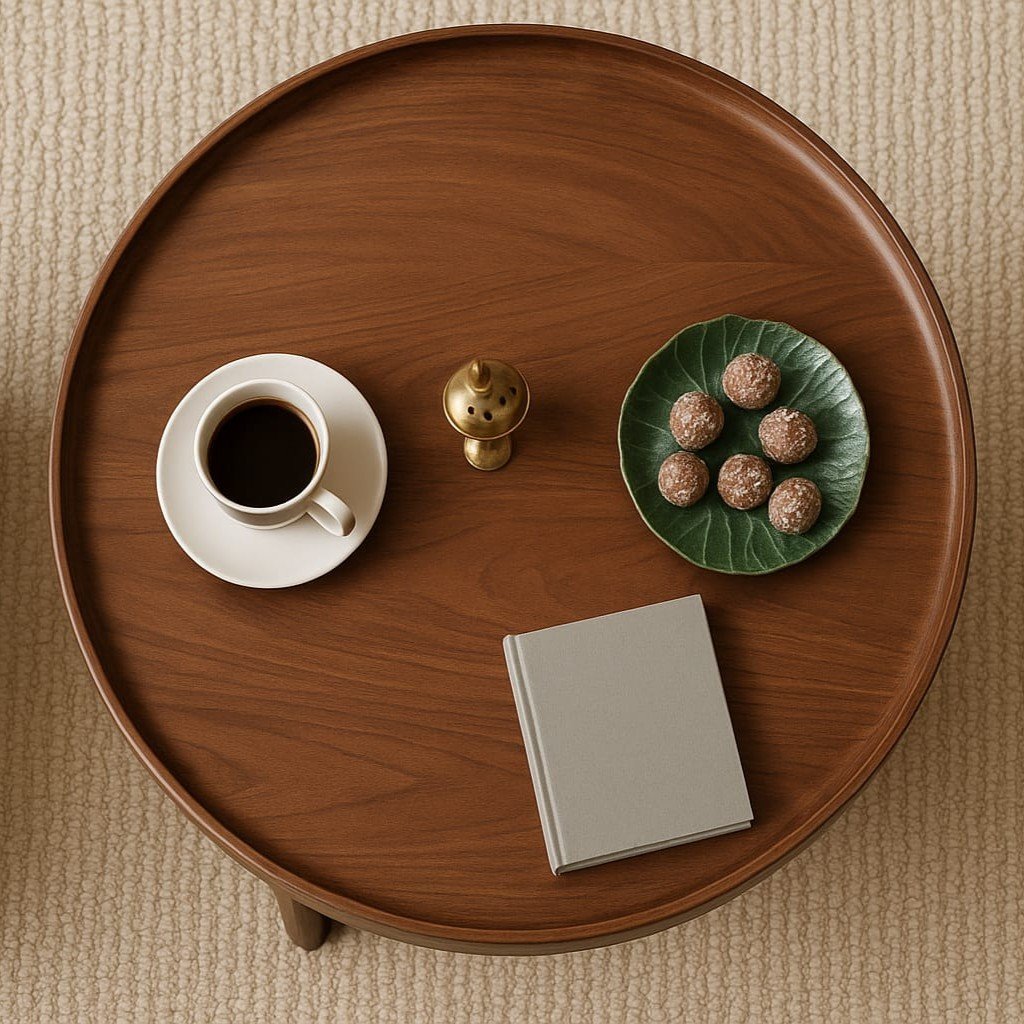 “Elegant wooden coffee table with cane detailing, featuring a round top, stacked books, and decorative items, placed in a cozy living room setting with soft lighting.”