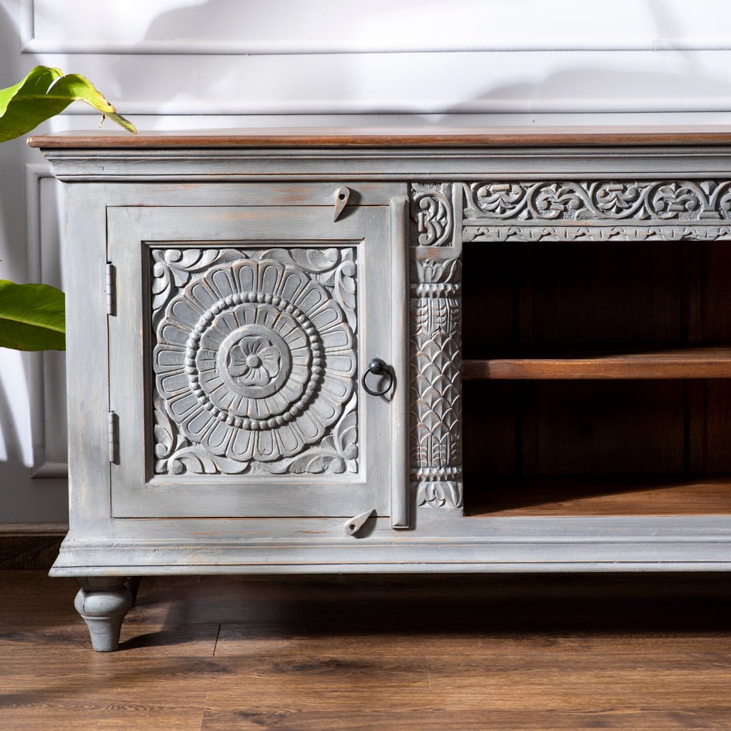 This solid wood TV unit features intricate handcarving and a charming rustic grey finish, blending timeless craftsmanship with modern functionality. A stylish and durable addition to your entertainment space.