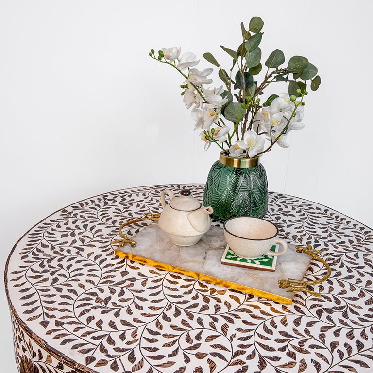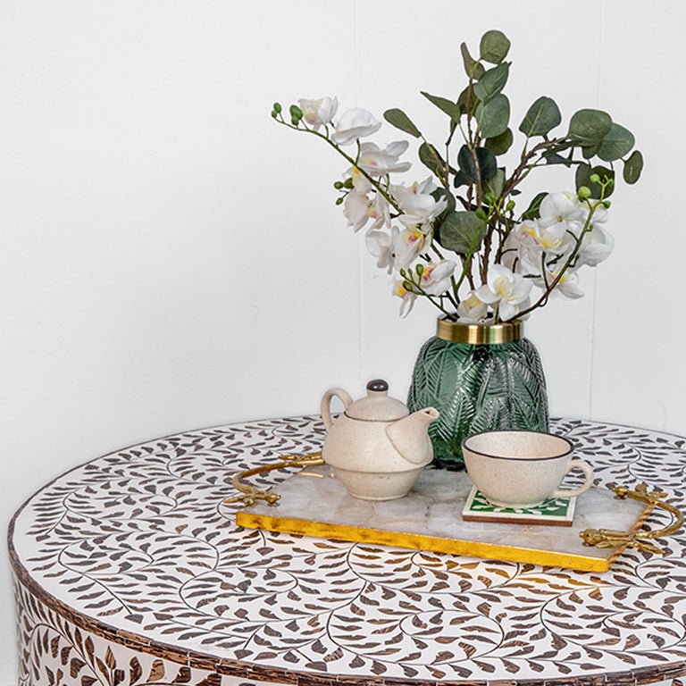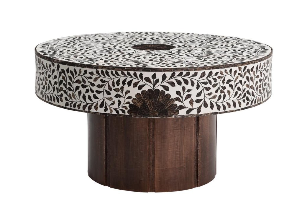 Tags: Artisan Design, Coffee Table, Handcrafted, Living Room Furniture, Scroll Vine Pattern, Statement Piece, Wood Inlay
