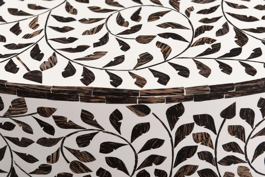 Featuring intricate scroll vine wood inlay on a solid wood frame, this coffee table combines craftsmanship with elegance. Its compact size makes it a perfect stylish centerpiece for any living room.