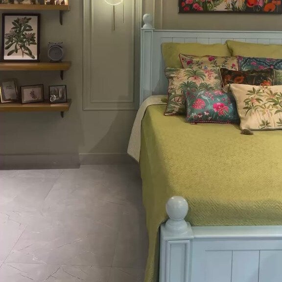 A spacious and robust solid wood bed inspired by coastal serenity, offering durable craftsmanship and a relaxing aesthetic for your bedroom retreat.