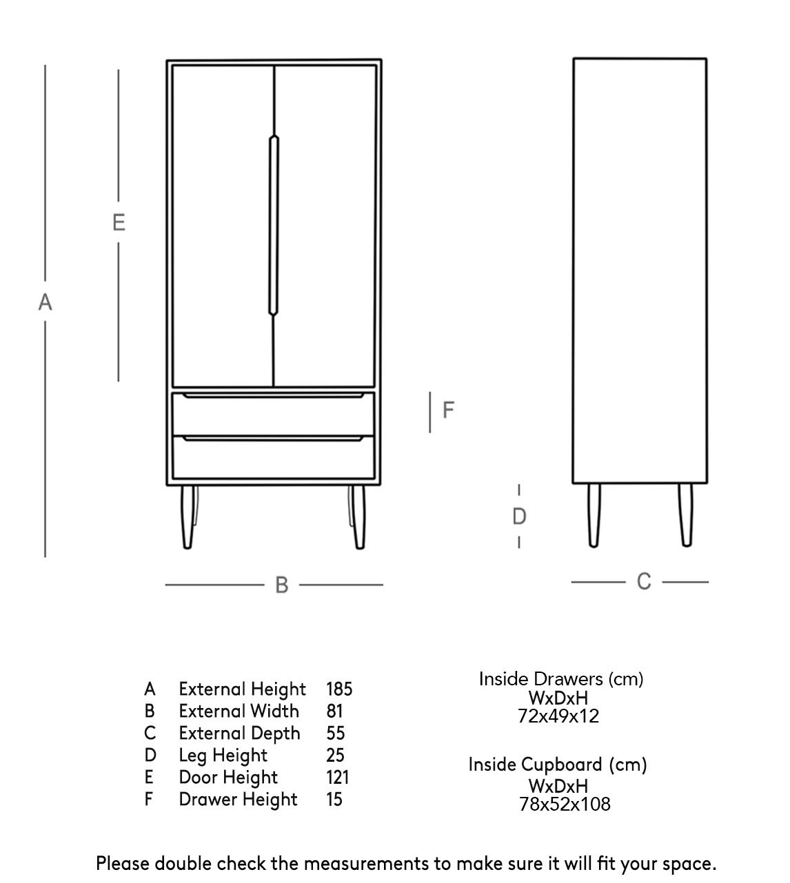 Dimensions: 55 cm (L) x 81 cm (W) x 185 cm (H)