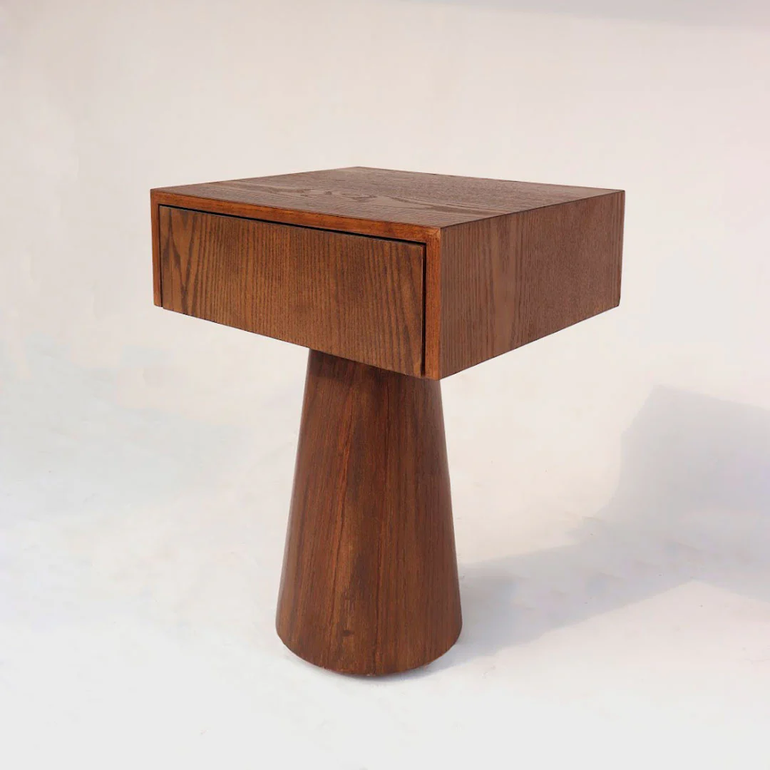 The T-Shaped Night Stand features a distinctive modern design with a sleek T-shaped silhouette. Crafted from solid wood, it offers a compact footprint with a drawer and open shelf for convenient bedside storage, perfectly blending style and functionality.