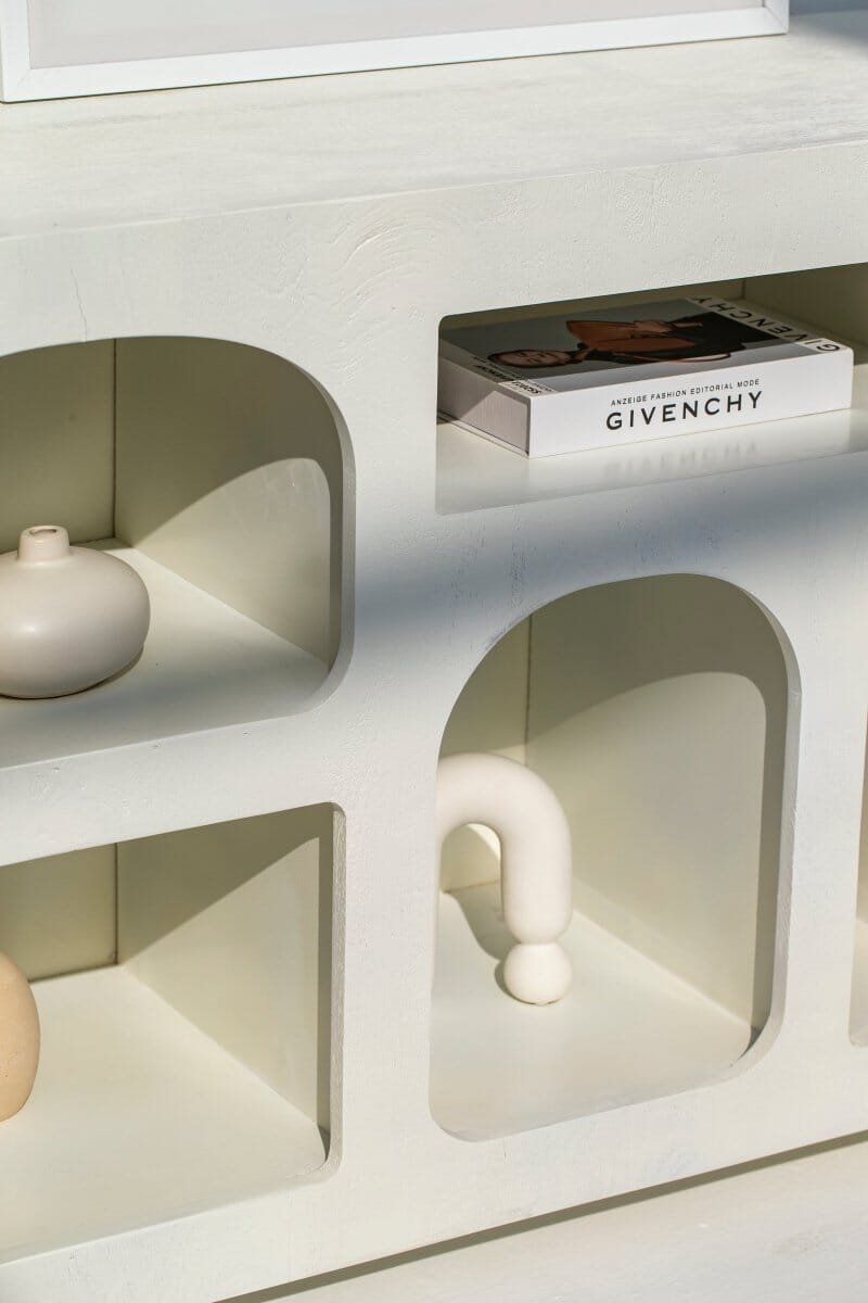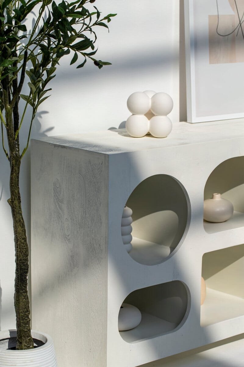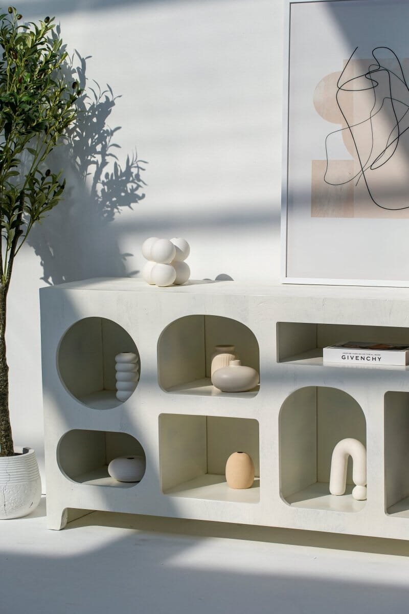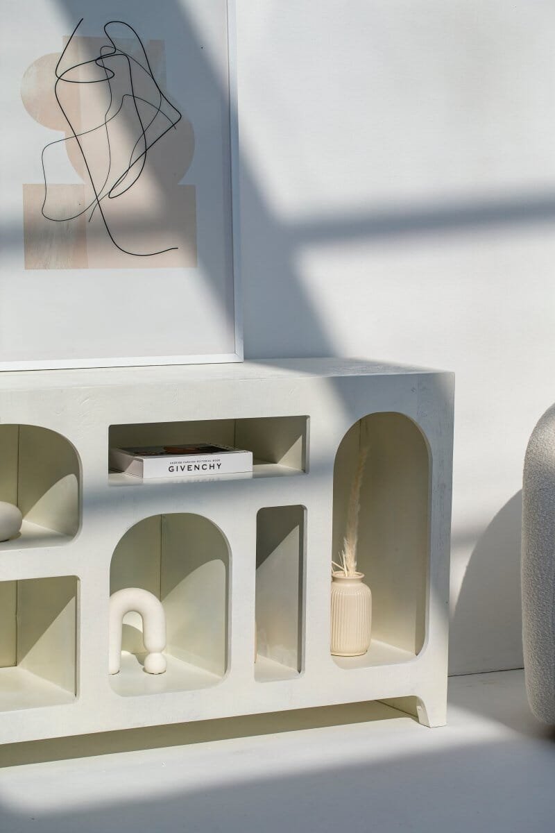 A charming solid wood display console with a white painted finish, perfect for showcasing décor while offering functional storage.