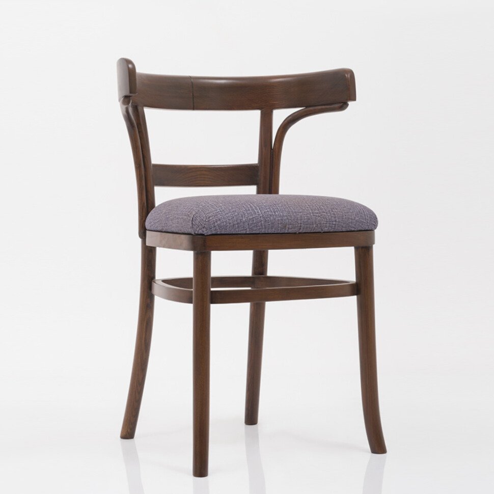 A charming vintage-style bistro chair crafted from solid wood, featuring a gracefully curved backrest and a comfortable upholstered seat. Ideal for dining rooms or cafés, combining classic elegance with lasting comfort.