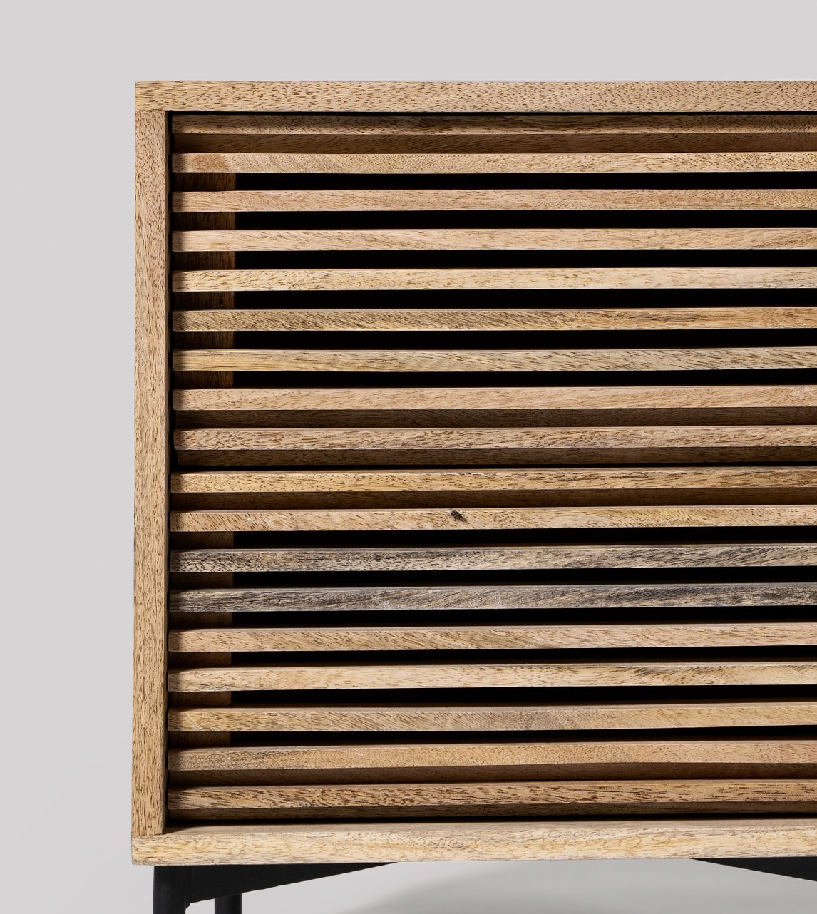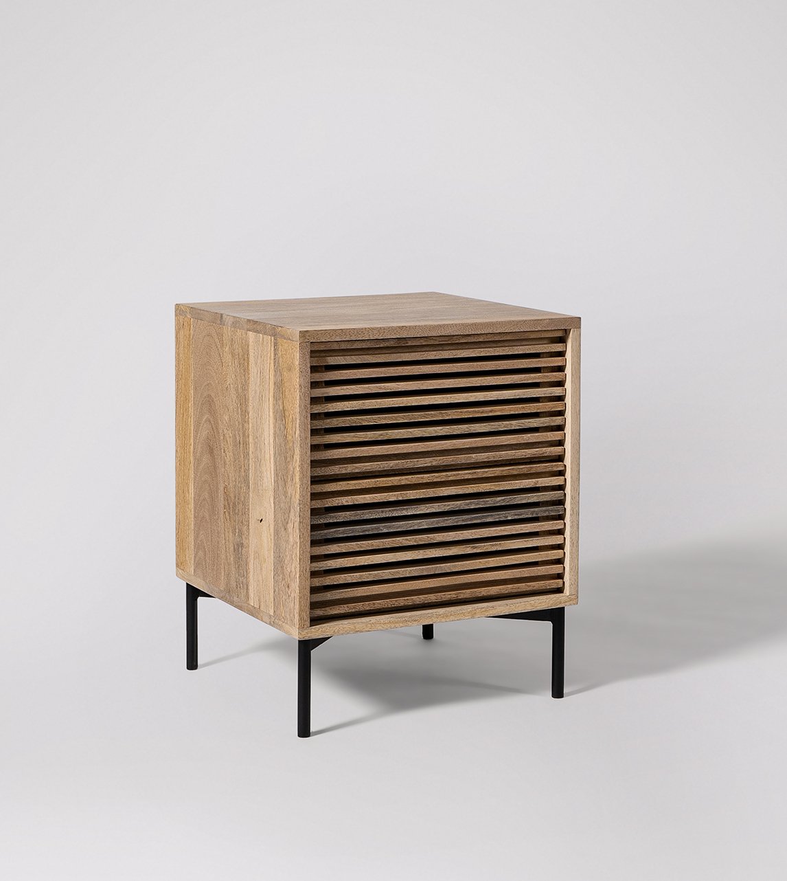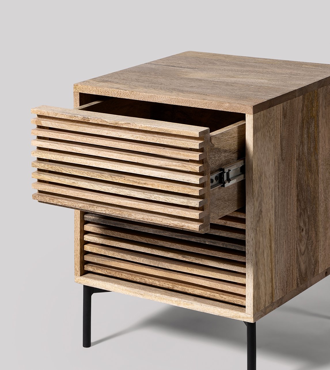 A beautifully crafted bedside table made from solid wood, featuring a woven design that adds texture and charm to any bedroom space.