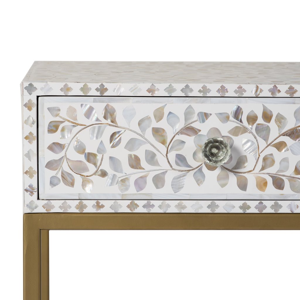 This elegant side table combines delicate white mother of pearl inlay on a solid wood frame with stylish gold legs, creating a luxurious and modern accent piece. Its compact size fits perfectly in any room.